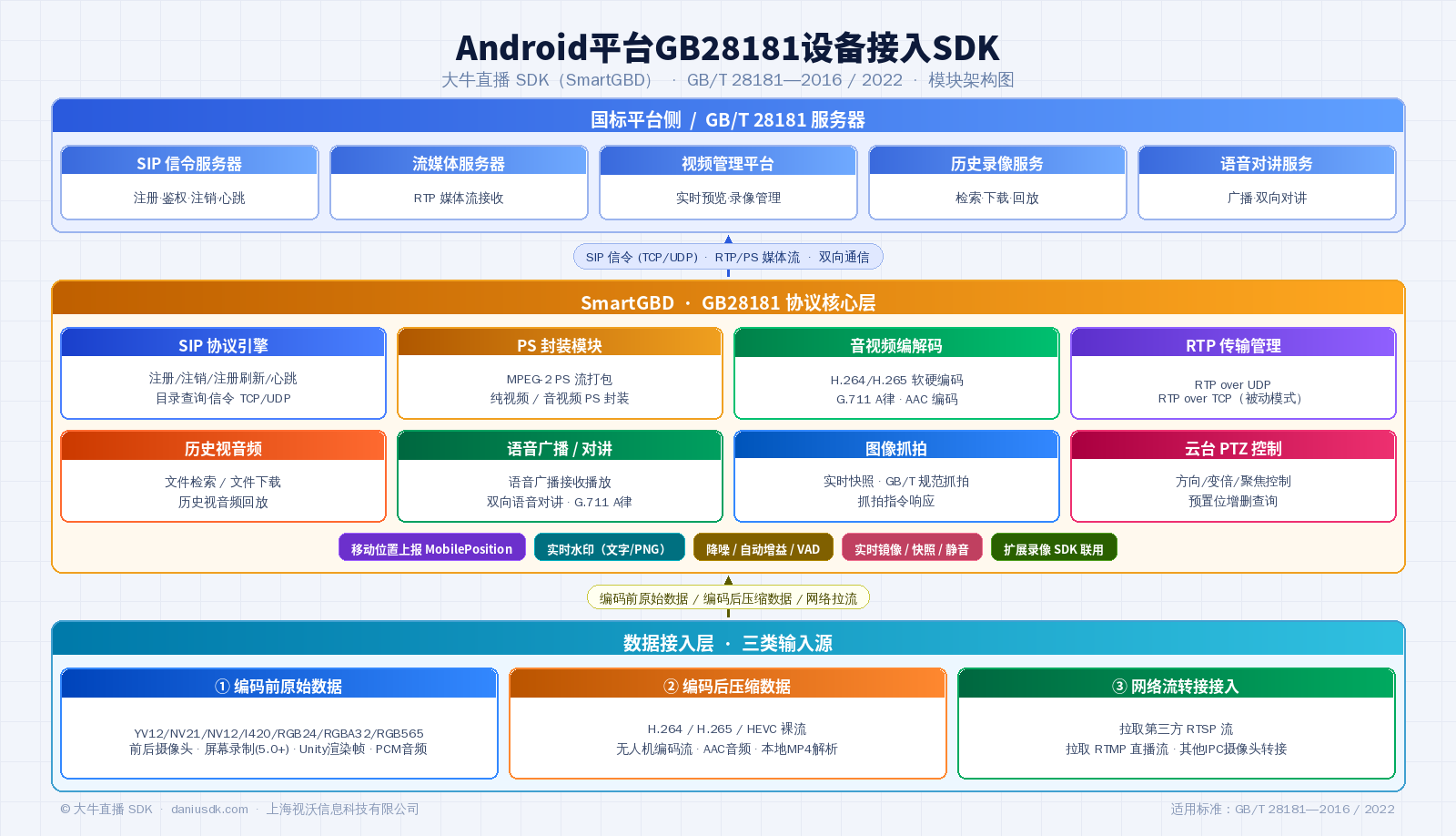 大牛直播SDK推出的Android平台GB28181接入SDK(SmartGBD),可实现不具备国标音视频能力的 Android终端,通过平台注册接入到现有的GB/T28181—2016或GB/T28181—2022服务,可用于如执法记录仪、智能安全帽、智能监控、智慧零售、智慧教育、远程办公、明厨亮灶、智慧交通、智慧工地、雪亮工程、平安乡村、生产运输、车载终端等场景,可能是业内为数不多功能齐全性能优异的商业级水准GB28181接入SDK。