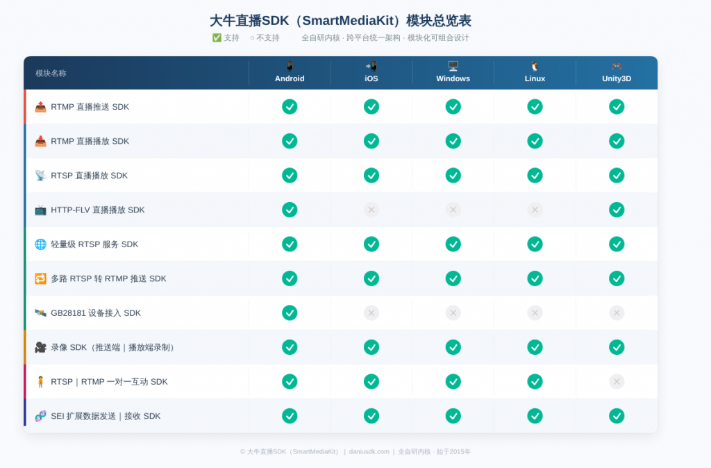 - 跨平台一致性:全面兼容 Windows、Linux(含麒麟)、Android、iOS、Unity3D,全平台接口统一、结构清晰,便于多端集成与维护。
